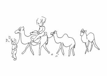 誰でもきっと子供の頃に読んだ絵本の中に「千一夜物語(アラビアンナイト物語)」があるはずですね。駱駝に乗って沙漠を旅するのは子供の頃の憧れをほんのちょっぴり叶えるようなものかもしれません。空飛ぶ絨毯やアリババの秘密の洞窟、アラジンの魔法のランプにも出会えそうな気がします。こうしているととてもロマンチックなのですが、残念ながらこの旅を不愉快にする野暮なやつがいるのです。蝿です。沙漠にいるといつのまにか、何百という蝿がまとわりついてきます。どこから来るのかわからないけど、いつのまにか体や荷物にびっしりと止まっているのです。うっとうしいことこの上なく、手で追い払うのですが、すぐに戻ってくるのであまり効果がありません。電気掃除機で全部吸い取ったらさぞすっきりするだろうと思いましたけど。 |