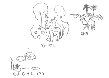 サハラはアフリカ大陸北部の広大な地域を占め、今は乾いた大地が横たわっているだけですが、かつては緑の木々が覆い茂っていたのだそうです。確かに今はその面影は何もありませんけど、アルジェリアにある数千年前の岩絵には数多くの動物が描かれているそうです。それだけ草木が豊富だったのです。残念ながらチュニジアにはそのような絵はありません。しかし、チュニジアに限らずサハラではあちこちで化石が見つかります。くらげが直接見つけたわけではないけれど、沙漠で3個ほど手に入れました。ひとつは明らかに二枚貝の形をしています。どうやらもっと昔のサハラは海の底だったということになります。本当のことはよく知りませんが、海底の砂紋が何万年かそれ以上の時間をかけて陸に上がって砂丘の風紋を作るようになったと思うと面白いと思いませんか? |