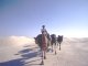 沙漠の途中で駱駝を発見しました。どうも何処かからか逃げてきたようで、足の縛られているのが2頭と何もされていないのが1頭。ガイドの駱駝使いは足を自由にしてくらげの乗っている駱駝につなぎましたが、元々自由な駱駝には何もしません。つながれた駱駝3頭は連なって歩いていきます。くらげは一頭残された駱駝が気になりました。いくら駱駝が沙漠に強いとは言っても置きざりではかわいそうです。でも、その残された駱駝はくらげ達の後を追ってくるのです。元々の州政か教え込まれたのか知りませんが、駱駝は群を作りたがるみたいです。一頭が動きだすと何となく付いてくるみたいです。途中で何故か駱駝が増えて、合計7頭になっても半分くらいは繋がなくても一緒についてきました。7頭もいるとちょっとしたキャラバンを組んでいるようでした。 |