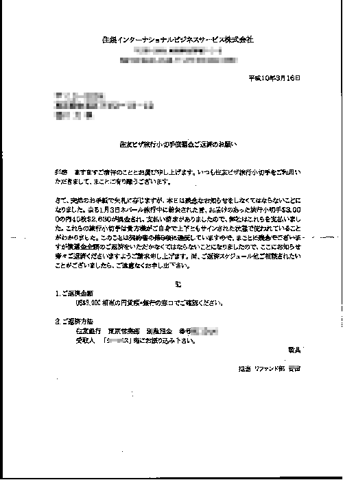 拝啓 ますますご清祥のこととお慶び申し上げます。いつも住友ビザ旅行小切手をご利用いただきまして、まことに有り難うございます。 さて、突然のお手紙で失礼に存じますが、本日は残念なお知らせをしなくてはならないことになりました。去る1月3日ネパール旅行中に紛失された旨、お届けのあった旅行小切手$3,000の内40枚$2,630が換金され支払い請求がありましたので、弊社はこれらを支払いました。これらの旅行小切手は貴方様がご自身で上下ともサインされた状態で使われていることがわかりました。このことは契約書の第3項に違反していますので、まことに残念でございますが償還金全額のご返済をいただかなくてはならないことになりましたので、ここにお知らせ旁々ご返済くださいますようご請求申し上げます。尚、ご返済スケジュール他ご相談されたいことがございましたら、ご遠慮なくお申し出下さい。