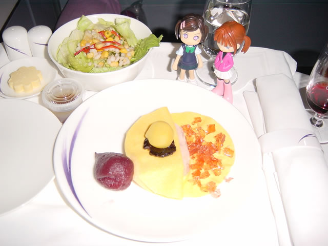 これが前菜ね。飛行機の中でもちゃんとテーブルクロスするんだね。 あー、おにいちゃんはワイン飲んでるし〜 |