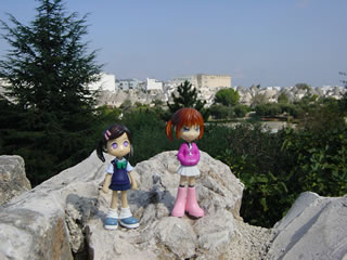 モモ子。なんだあれ。石の小屋みたいのがあちこちにあるよ。 |